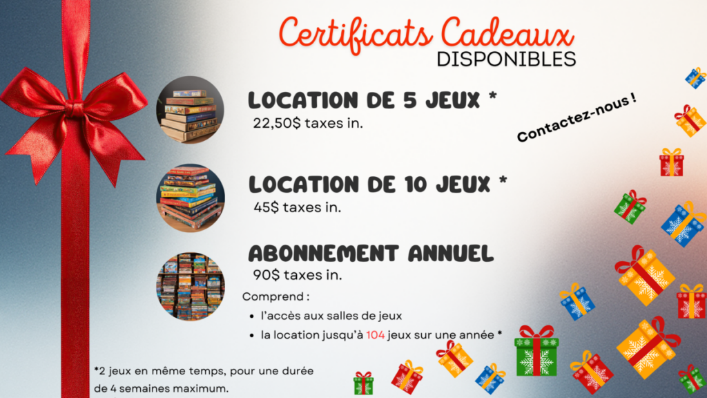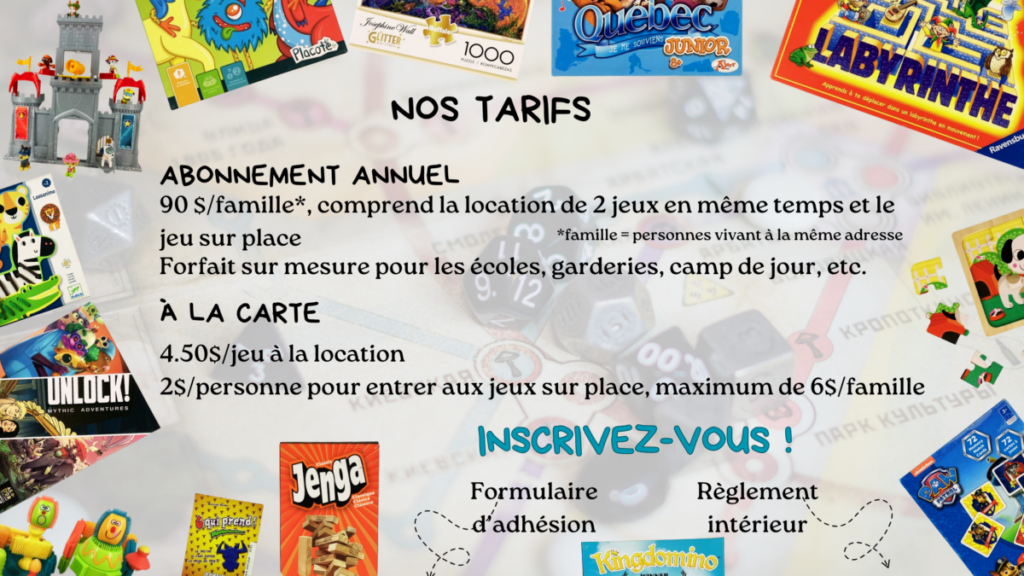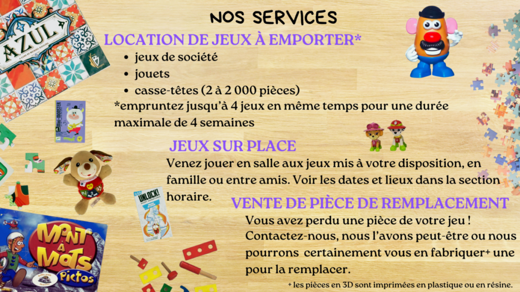 ONBL dans les Laurentides. La ludothèque permet d’emprunter des jeux, jouets, casse-tête pour tous âges. Abonnement annuel ou location à l’unité.